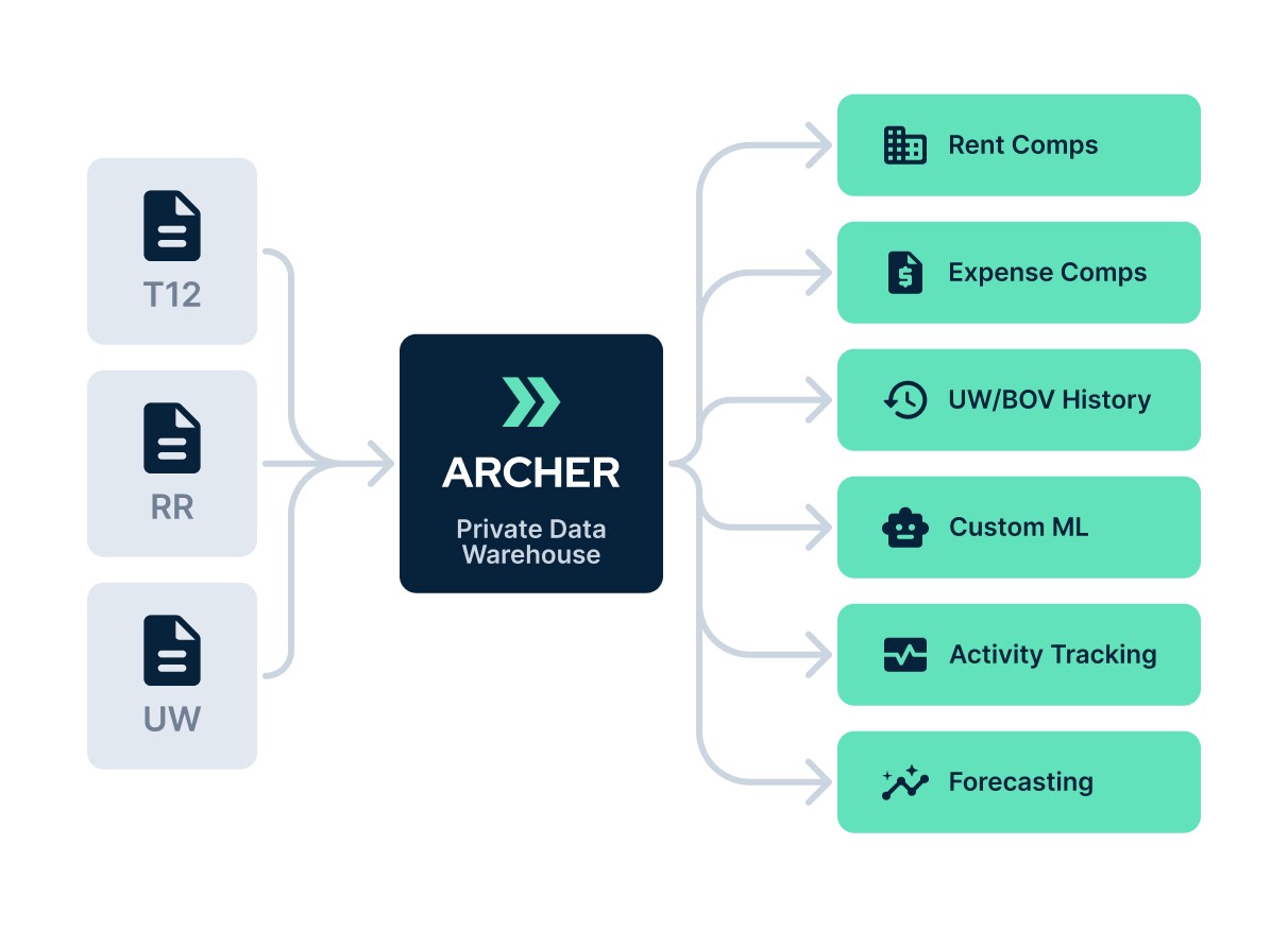 • Private Data Cloud: Archer’s platform automatically captures and structures critical information from every deal analysis directly from our smart integration into our users’ Excel model. The secure data cloud offers easy search, effortless comparisons, and the ability to identify trends that were previously invisible.